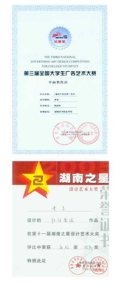 2005年 设计作品获湖南之星艺术大奖赛优秀奖;