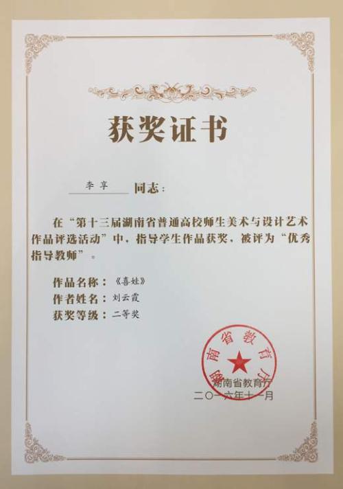 2016年 第十三届胡南省普通高校师生美术与设计艺术作品评选活动获“优秀指导奖”。
