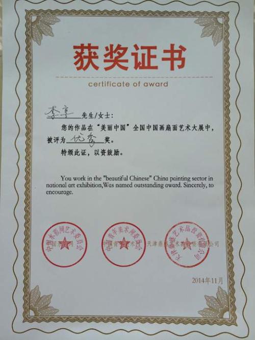 2014年 获”美丽中国中国画扇面艺术大赛优秀奖;