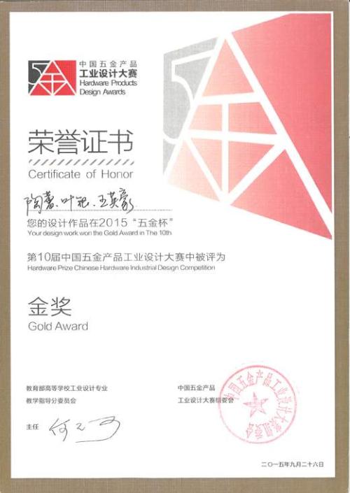 第十届中国五金产品工业设计大赛金奖、全国工业设计大赛二等奖、浙江省工业设计特等奖、浙江省和丰杯创意银奖、第十一届“创意