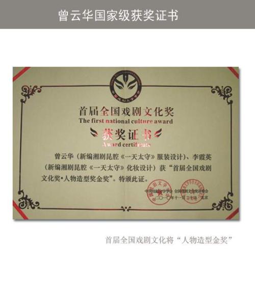 2010年11月 获得首届全国戏剧文化奖人物造型金奖。